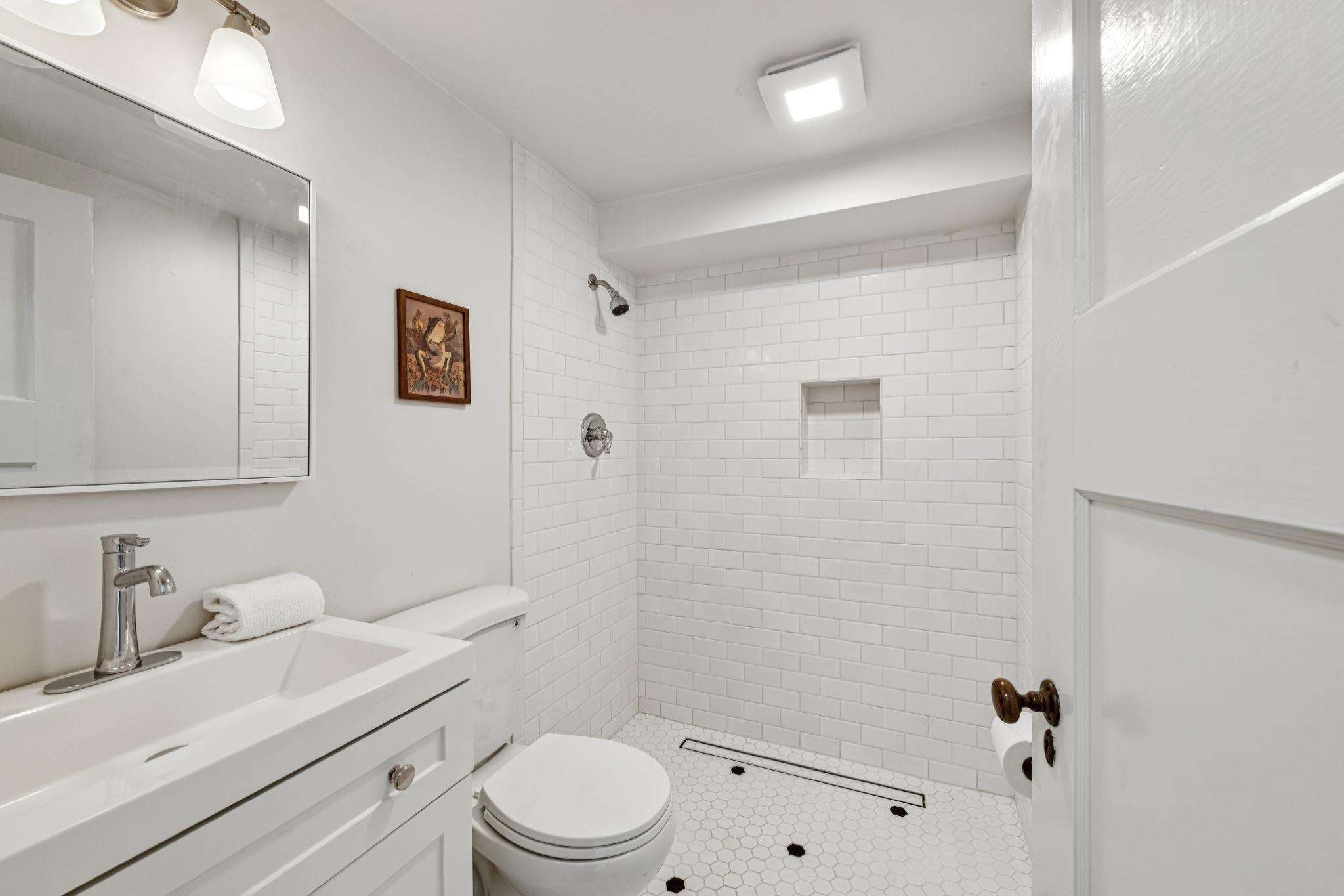 At the heart of the home, the chef’s kitchen and dining room were taken to the studs and thoughtfully reimagined by acclaimed contractor Custom Kitchens. The timeless remodeled kitchen opens seamlessly to the formal dining room with original built-ins and a breakfast bar (countertops made of unique Cherrybrook Cambria quartz)—creating a warm and inviting space ideal for entertaining. A sweet deck just off the kitchen invites morning coffee or evening relaxation. The gorgeous full bath with tub completed the extensive remodel.