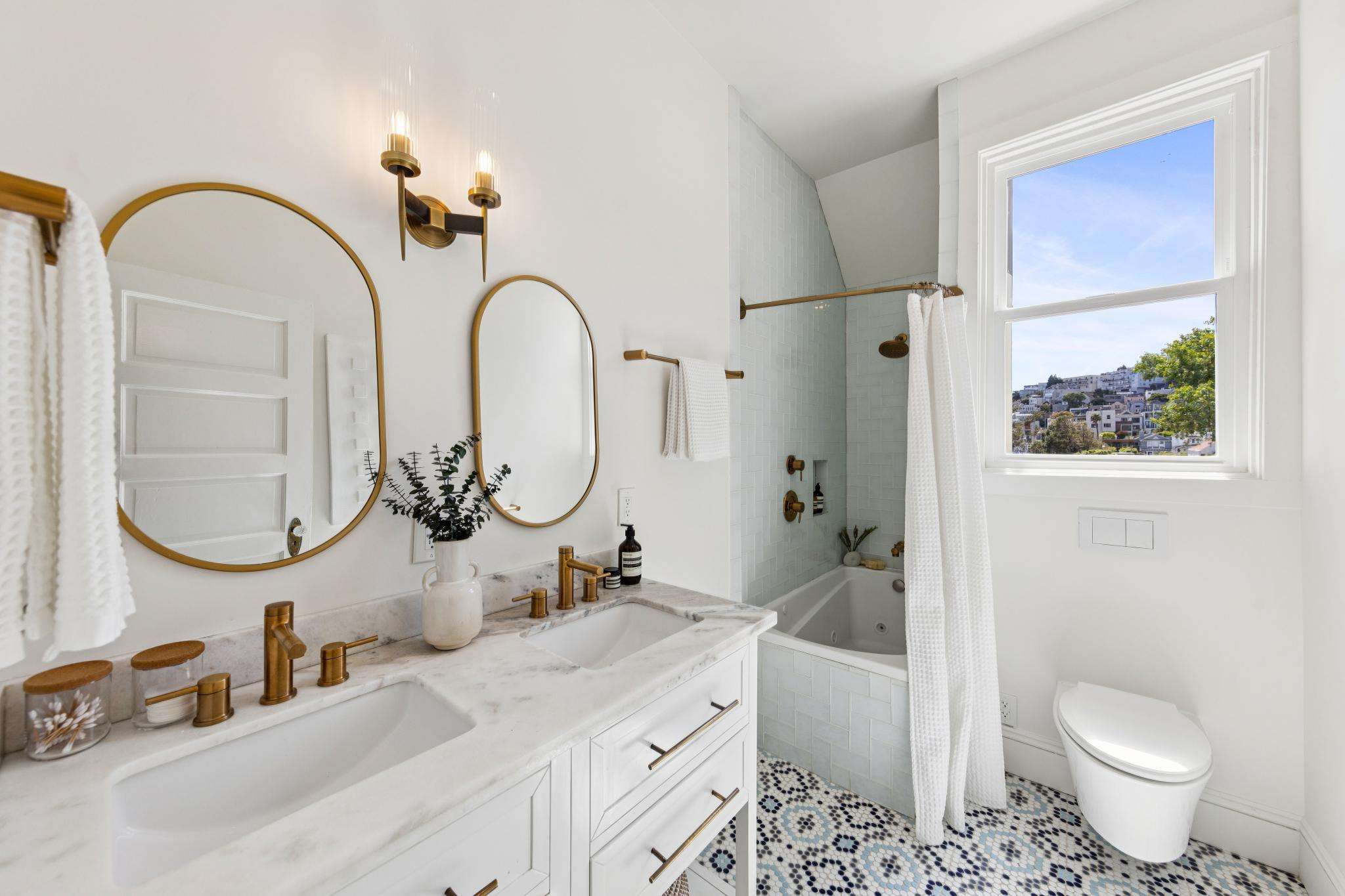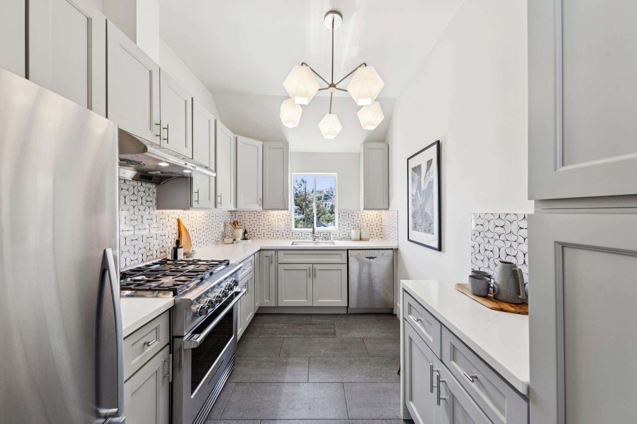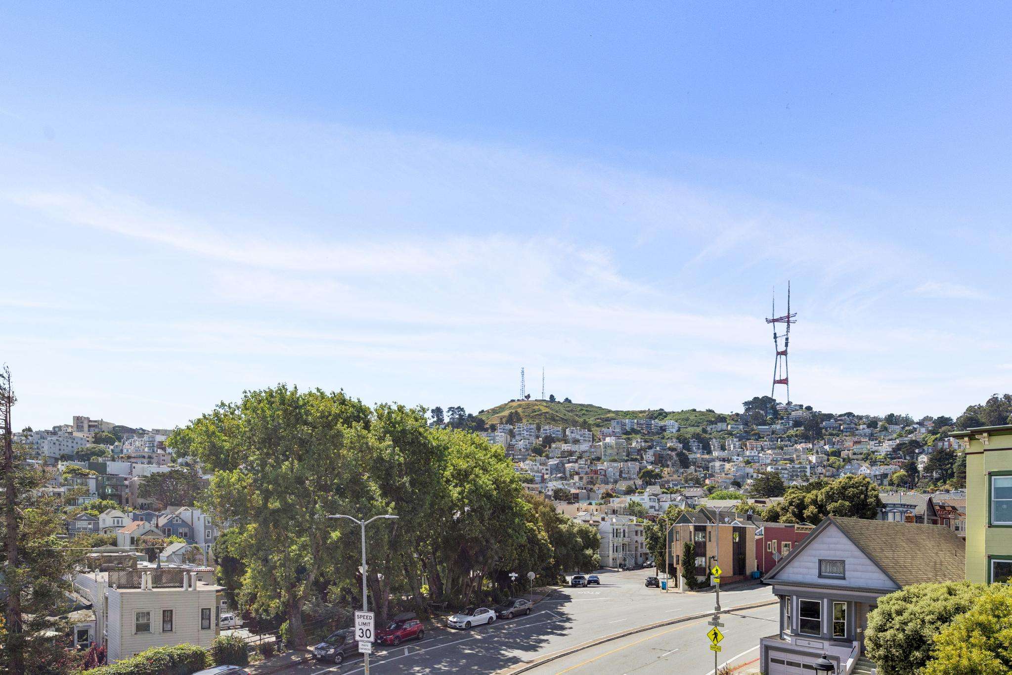 Light-filled, top level, two bedroom condo with extra home office/sunroom in a prime location! Quiet, tree-lined street, but steps to the Castro - 91 WalkScore! Quintessential SF Castro and Mt Sutro views, plus the Berkeley and Oakland Hills, all the way to Mt. Diablo. Sun-drenched living room with beautiful decorative fireplace and bay windows. French doors open to a flexible bedroom space, or double parlor family space. Quiet, spacious primary bedroom. Large, bright renovated kitchen with stainless Fisher & Paykel gas stove & refrigerator, Bosch dishwasher, quartz counters and views of the Castro hillside. Formal dining room with beautiful outlooks - perfect for entertaining. Bonus sunroom/office lined with windows framing views offers sliding glass door to a small porch. Renovated, sumptuous bath with double sink vanity, bath tub with jets, and mosaic tile. Warm refinished wood floors throughout. Deeded rights to develop the expansive attic level. Washer/dryer and storage. Well-run, 2-unit HOA in meticuously maintained Victorian beauty. Steps to Castro - easy walk to the Mission, Noe, and the Haight. Only 4 blocks to the Castro MUNI station and tech-shuttles. Easy street parking. Minutes to 101/280. Must see! HOA Dues: $375/month.