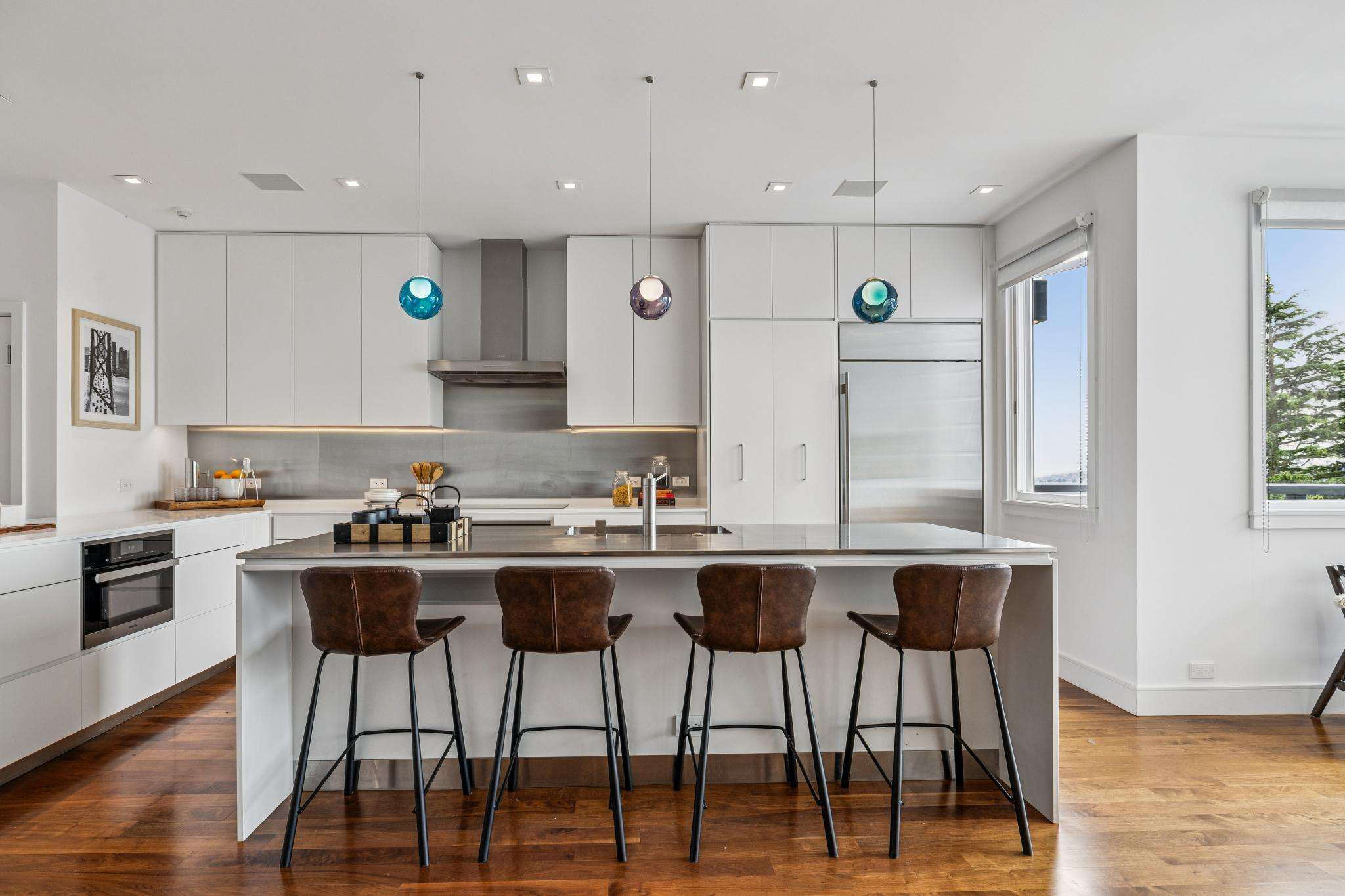 A floor-to-ceiling fireplace anchors the living area, which offers generous proportions—easily accommodating a grand piano. The kitchen is centered around a stunning stainless steel island with counter seating, outfitted with Sub-Zero and Miele appliances and bespoke cabinetry. Multiple flexible-use spaces lend themselves to dining, a home library, studio, or intimate sitting room, all leading to the home's showpiece: walls of glass that dissolve the boundary between indoors and out, opening onto a spacious deck made for al fresco dining and effortless entertaining against the backdrop of the city's southern hills.