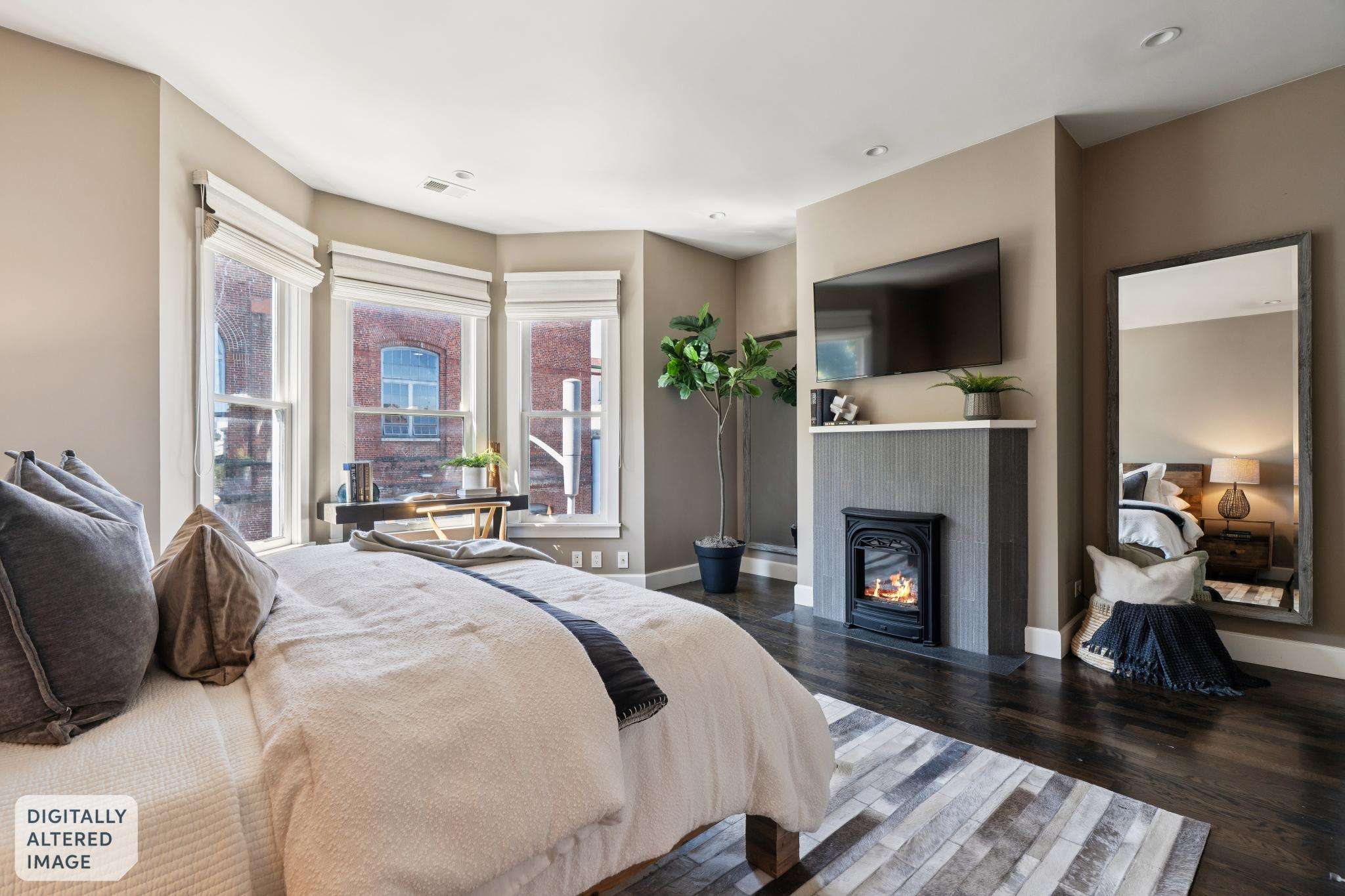 The primary suite offers a peaceful retreat, complete with a walk-in closet with custom built-ins. A tiled bath with bespoke fixtures, along with in-unit laundry and forced air heating, enhance everyday comfort. Double-paned windows and recessed lighting complete the home’s modern upgrades.