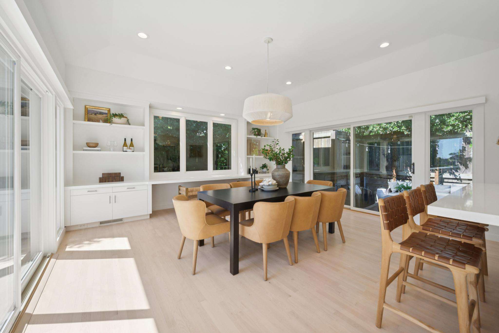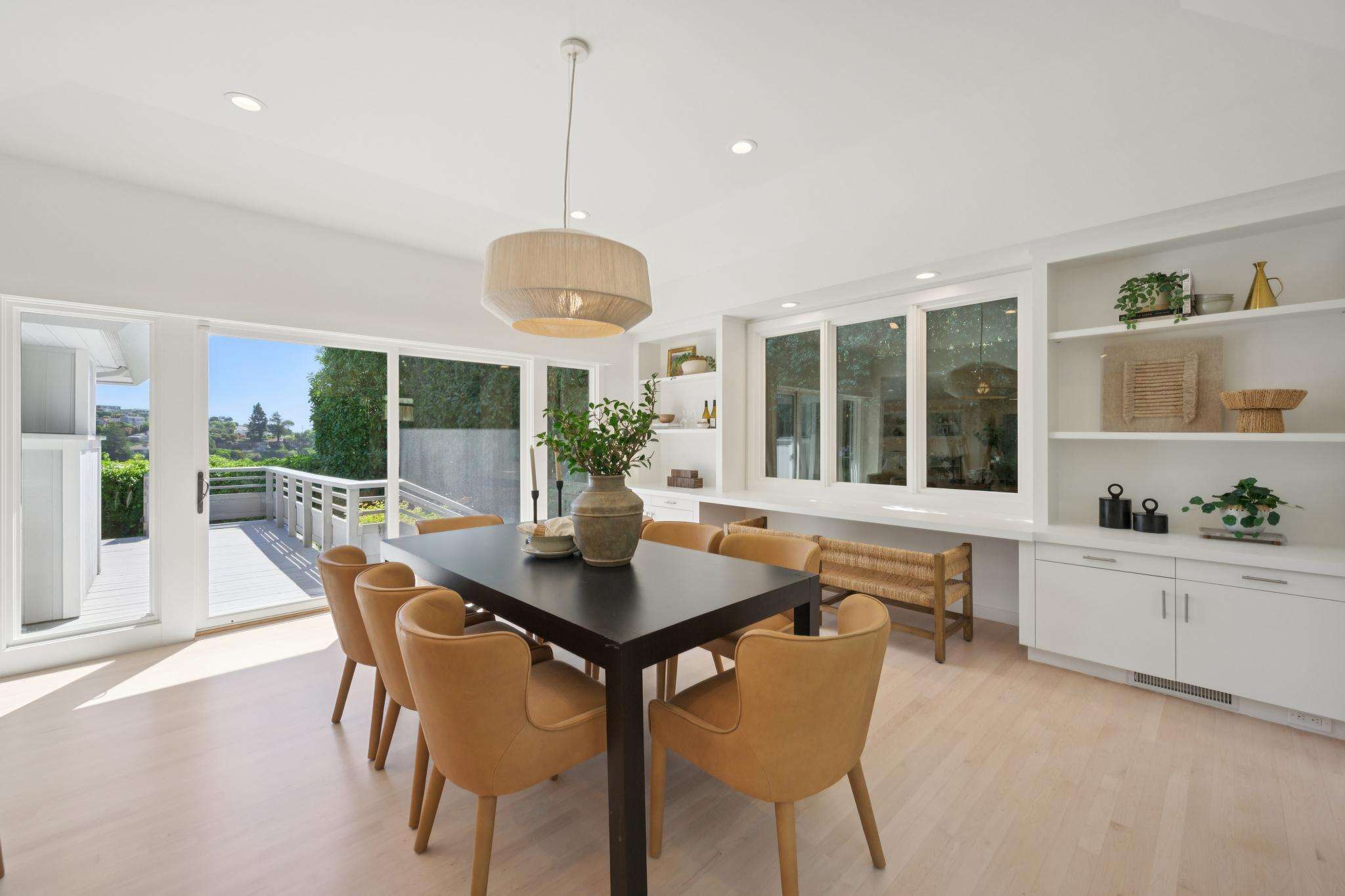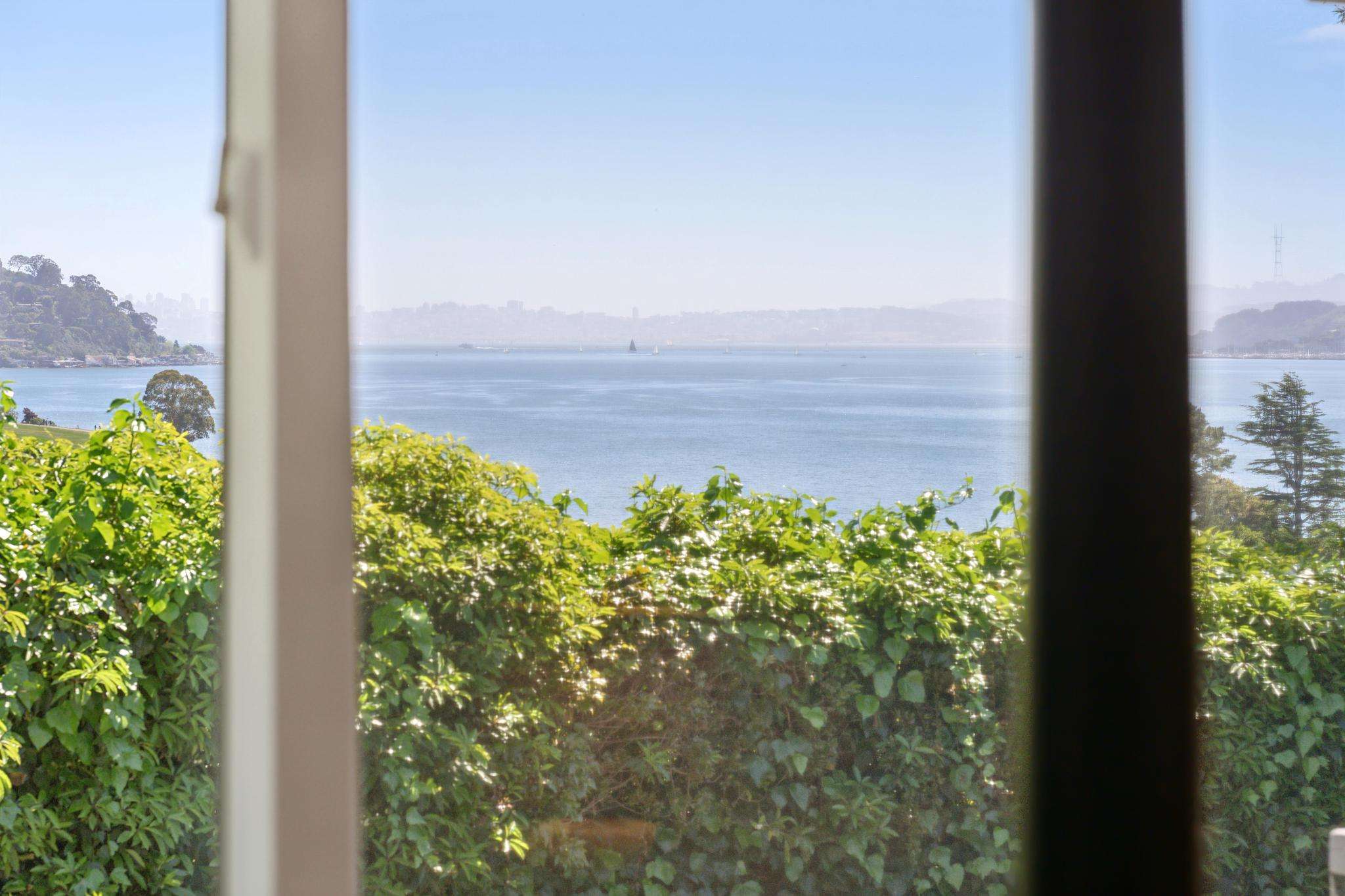 The main living level is beautifully appointed with refinished wood floors, recessed lighting & an abundance of expansive sliding glass doors throughout, bringing the home's incredible setting into every space. The open, airy layout soaks in sweeping views of Richardson Bay, the San Francisco skyline, Angel Island & beyond. The spacious living room is a true showpiece, featuring stunning "wow" views, a fireplace & wide sliding doors that open to the expansive view deck. The chef's kitchen is beautifully designed with quartz countertops, a large center island, abundant cabinetry & stainless-steel appliances, complemented by a window overlooking lush landscaping & opening seamlessly to the living & dining areas; creating an ideal setting for everyday living & effortless entertaining. The generous dining room includes custom built-in shelving & two sets of sliding doors, one opening to a private landscaped patio & the other connecting to the view deck & backyard beyond. Also on this level is a primary suite with a full bathroom & access to a serene landscaped patio, along with two additional bedrooms & a second full bathroom, each enjoying natural light & yard or bay outlooks.