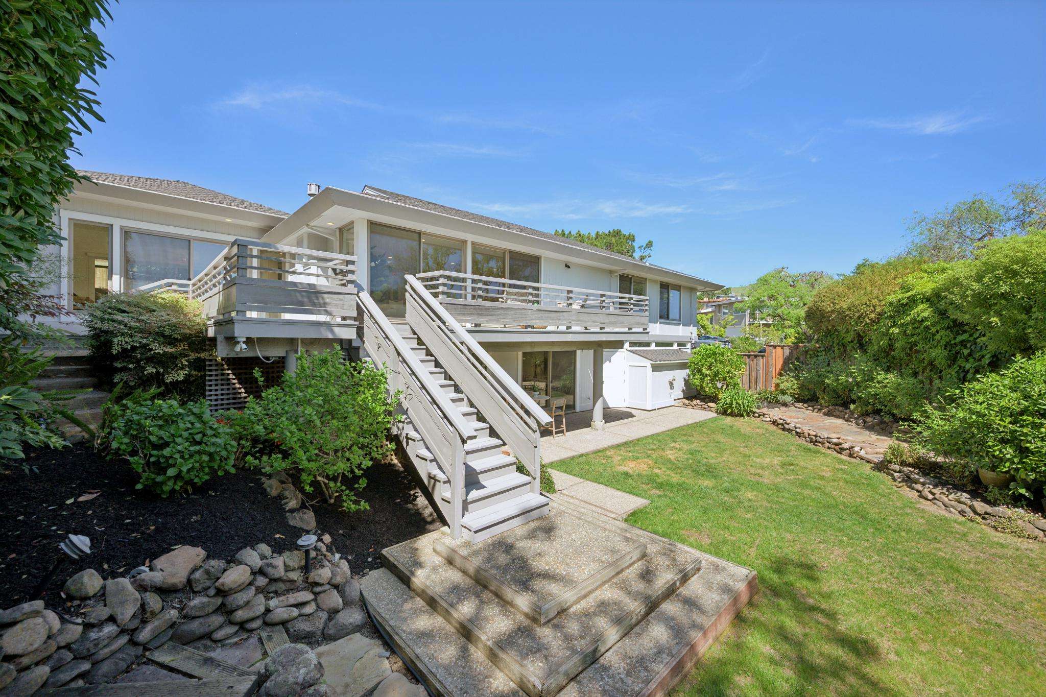 The lower level offers exceptional flexibility, featuring a great room & a second primary suite with a walk-in closet, en-suite bath & direct access to the patio & level lawn. With two primary suites on separate levels, the home is ideally suited for guests, extended family or a private work-from-home lifestyle. Surrounded by fruit trees & lush landscaping, the outdoor spaces create a serene & private garden setting. Additional highlights include a two-car attached garage, ample storage & a versatile layout. Enjoy easy access to nearby Ring Mountain trails & the Jefferson stairs to Belveron & Blackie's Pasture. Ideally located near Highway 101, Cove Shopping Center & downtown Tiburon's vibrant waterfront with acclaimed restaurants, boutiques & Yacht Clubs. Reed Union School District.