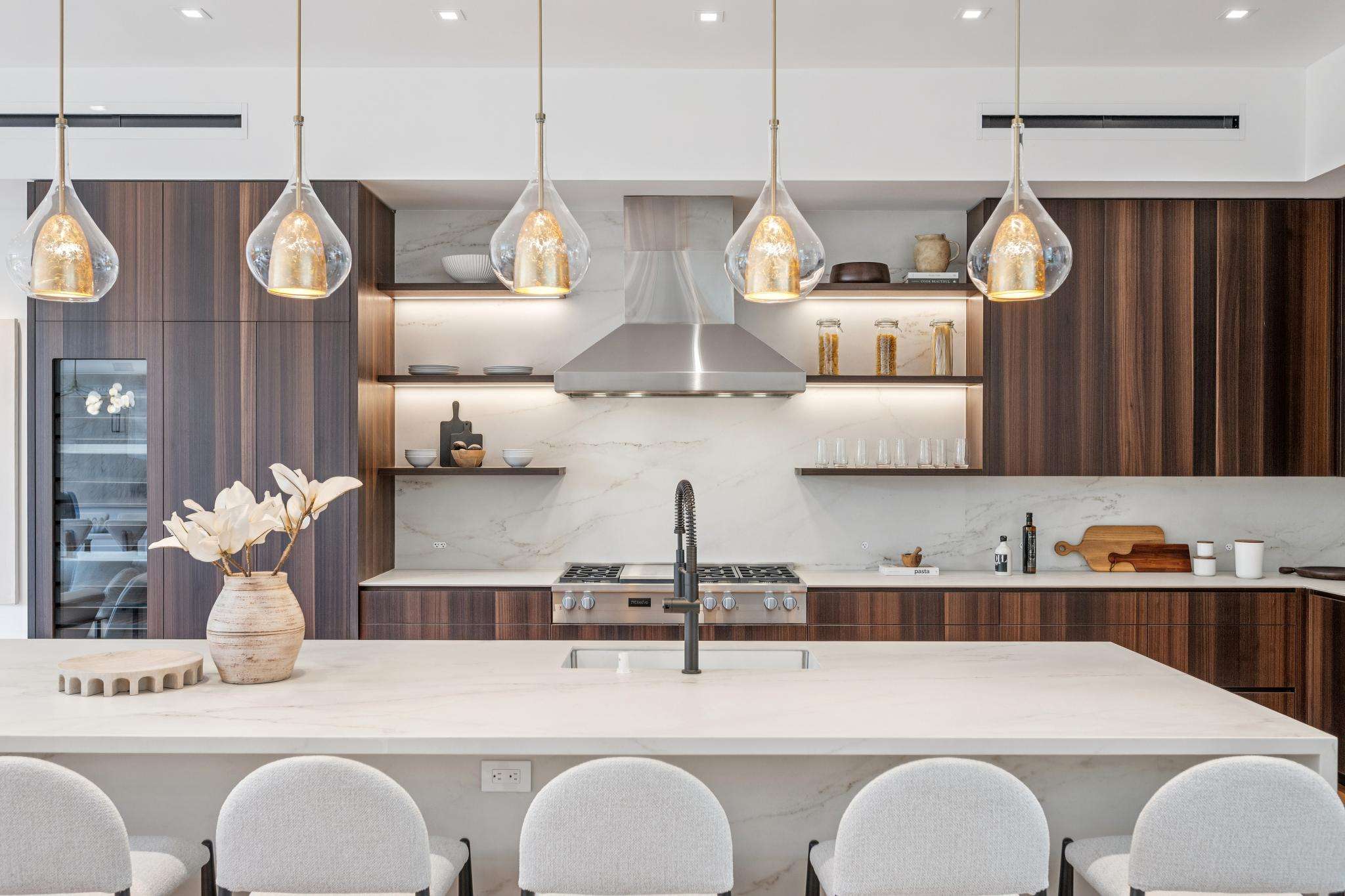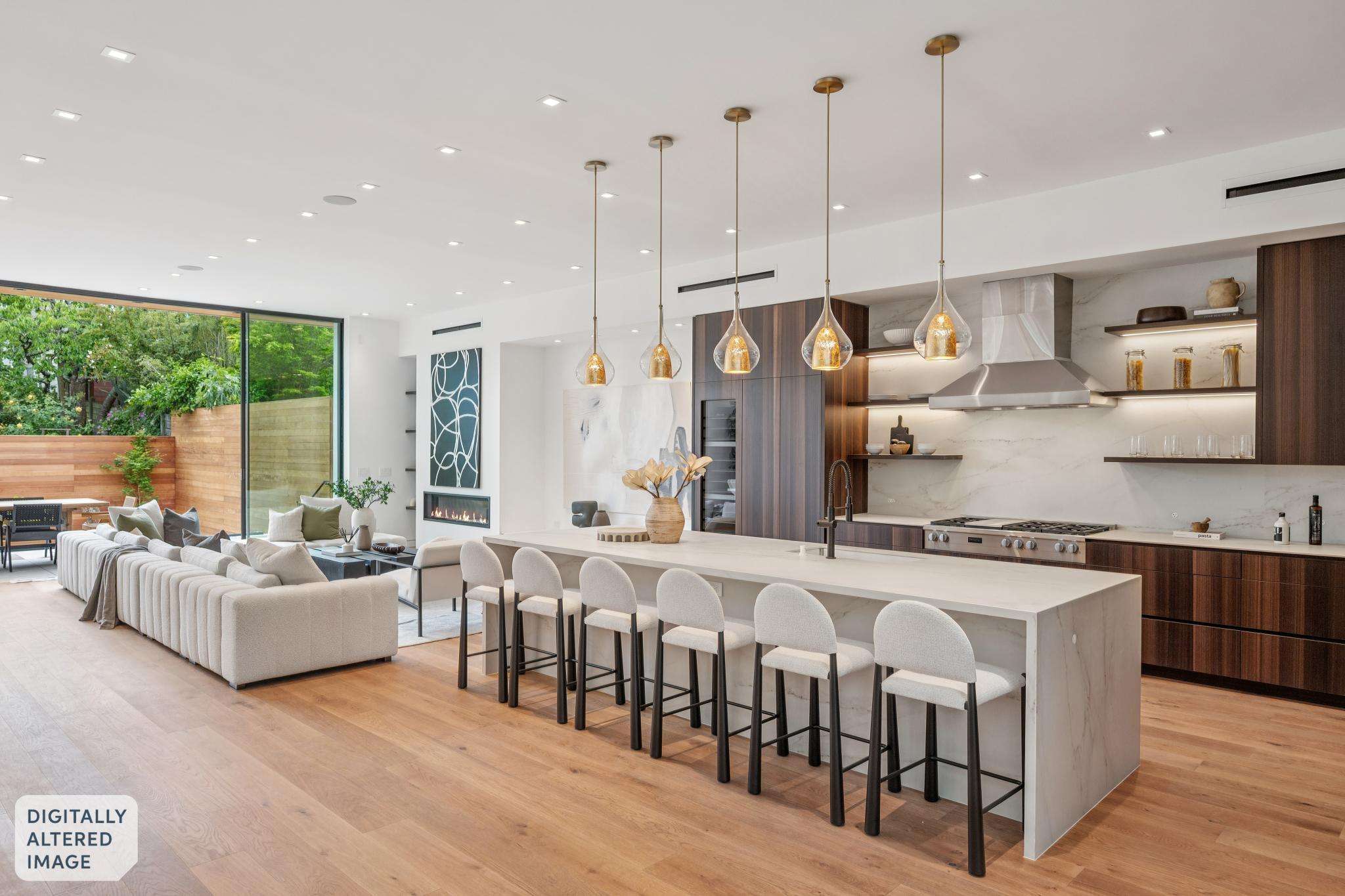The chef’s kitchen is appointed with top‑of‑the‑line European appliances, including Gaggenau and Miele, and is complemented by generous custom cabinetry including a dedicated pantry, refrigerator, and freezer. A massive waterfall edge island in ultra-durable, beautiful Dekton, with sink, an auxiliary prep sink, wine refrigeration, two dishwashers and abundant storage complete the space. The adjacent living and dining area is anchored by a statement gas fireplace and flows effortlessly to the outdoor areas.