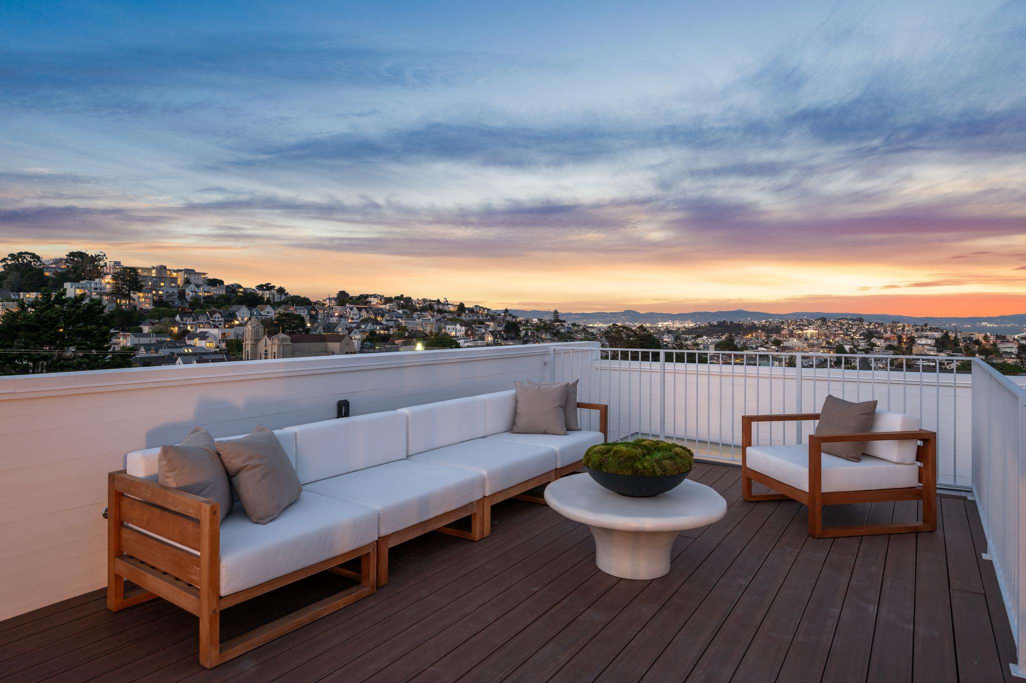 Additional features include radiant floor heating throughout, exquisite lighting and faucet fittings, recessed lighting, integrated speakers, laundry on two levels, and a 3‑car garage with interior access and EV-ready. A roof deck crowns the home with panoramic views stretching from the Bay to Twin Peaks and is thoughtfully pre-engineered for a hot tub and sauna.