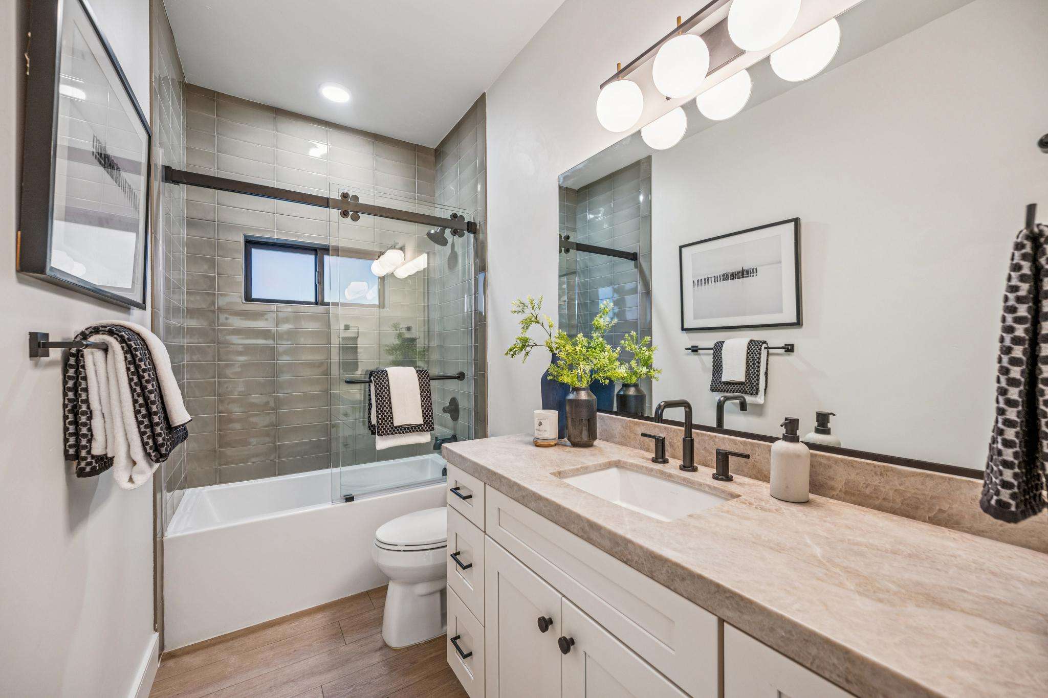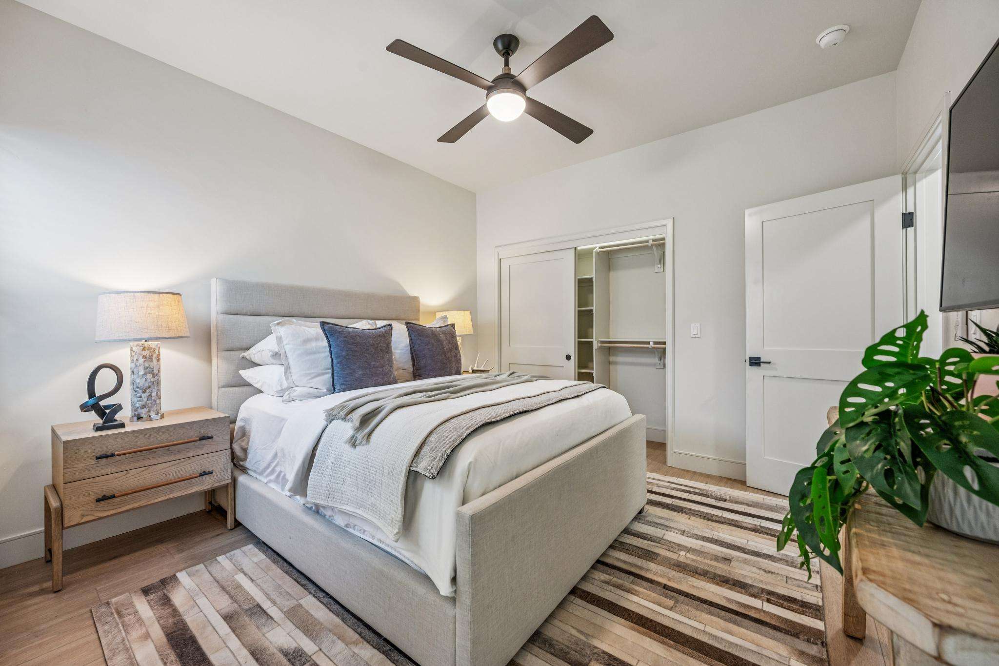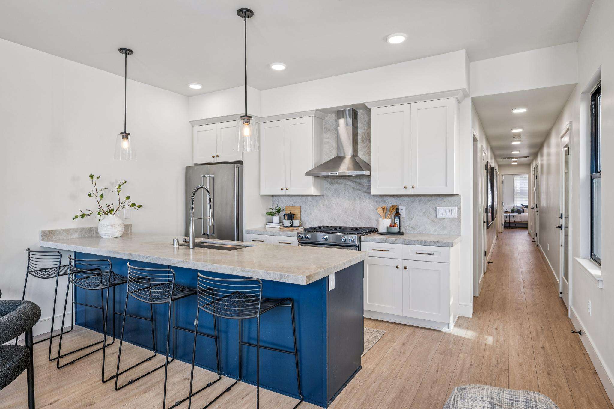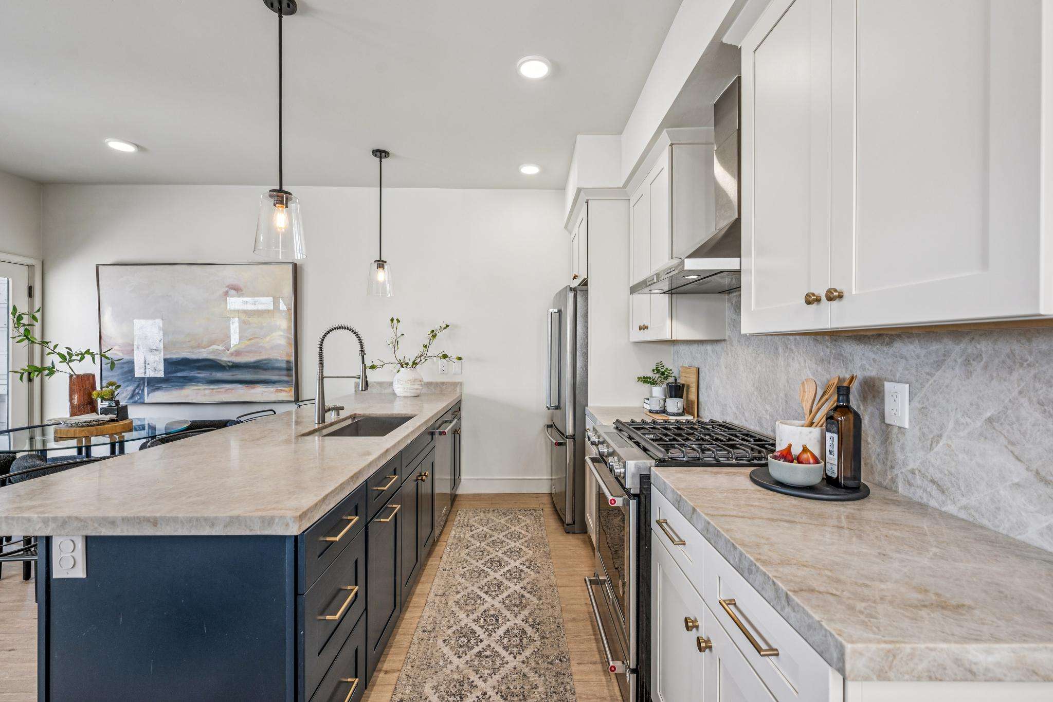 The chef’s kitchen is fully remodeled with Shaker‑style cabinetry, quartz countertops, and stainless steel appliances, including a gas stove, dishwasher, and refrigerator. The layout works well for both daily living and entertaining. The primary bedroom features an ensuite bath with a walk‑in shower finished floor to ceiling in designer tile. Each bedroom includes closet storage. A dedicated laundry room with a full‑size washer and dryer adds convenience, and an assigned storage room on the ground level is included.